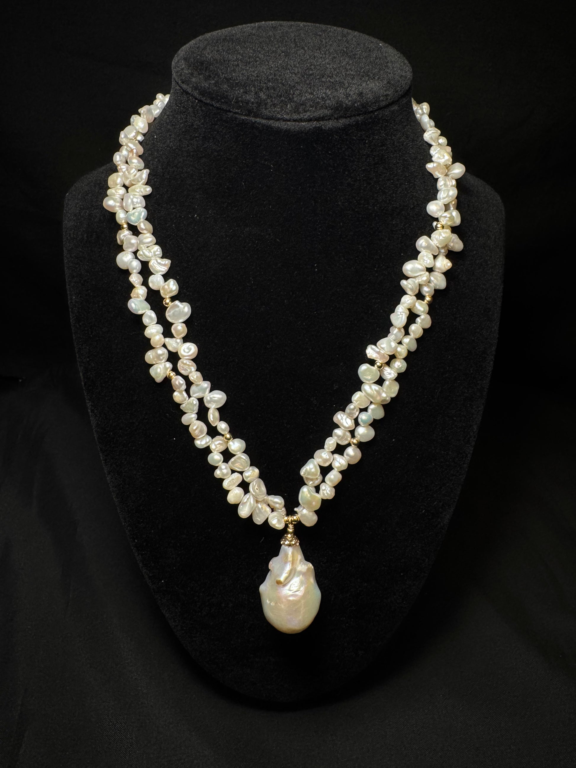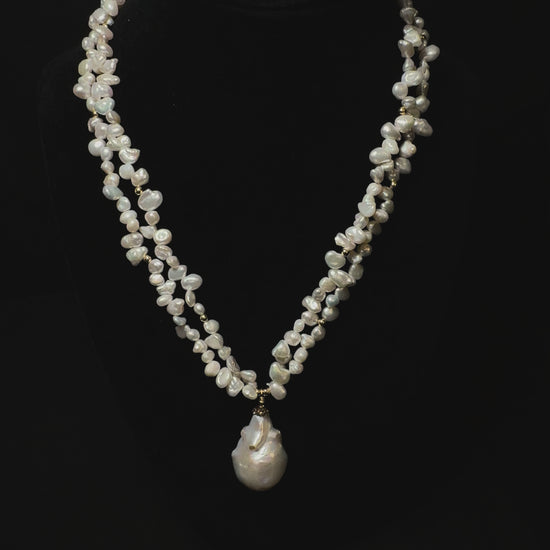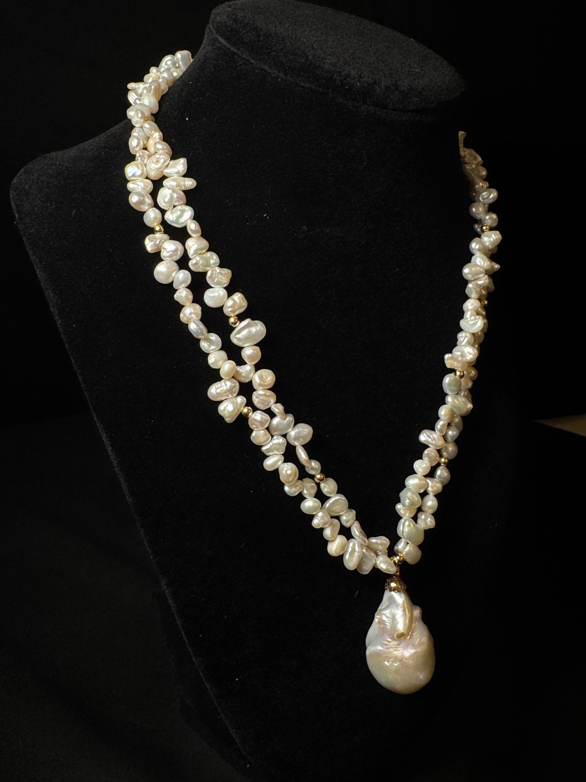 At the heart of this creation lies a genuine baroque pearl pendant, crowned with a hand-set cluster of champagne pavé crystals that shimmer like sunlight dancing on calm waters. Surrounding it, a double-twist strand of Keshi Pearls unfolds — each uniquely shaped, luminous, and organic, creating a fluid texture that feels alive against the skin.