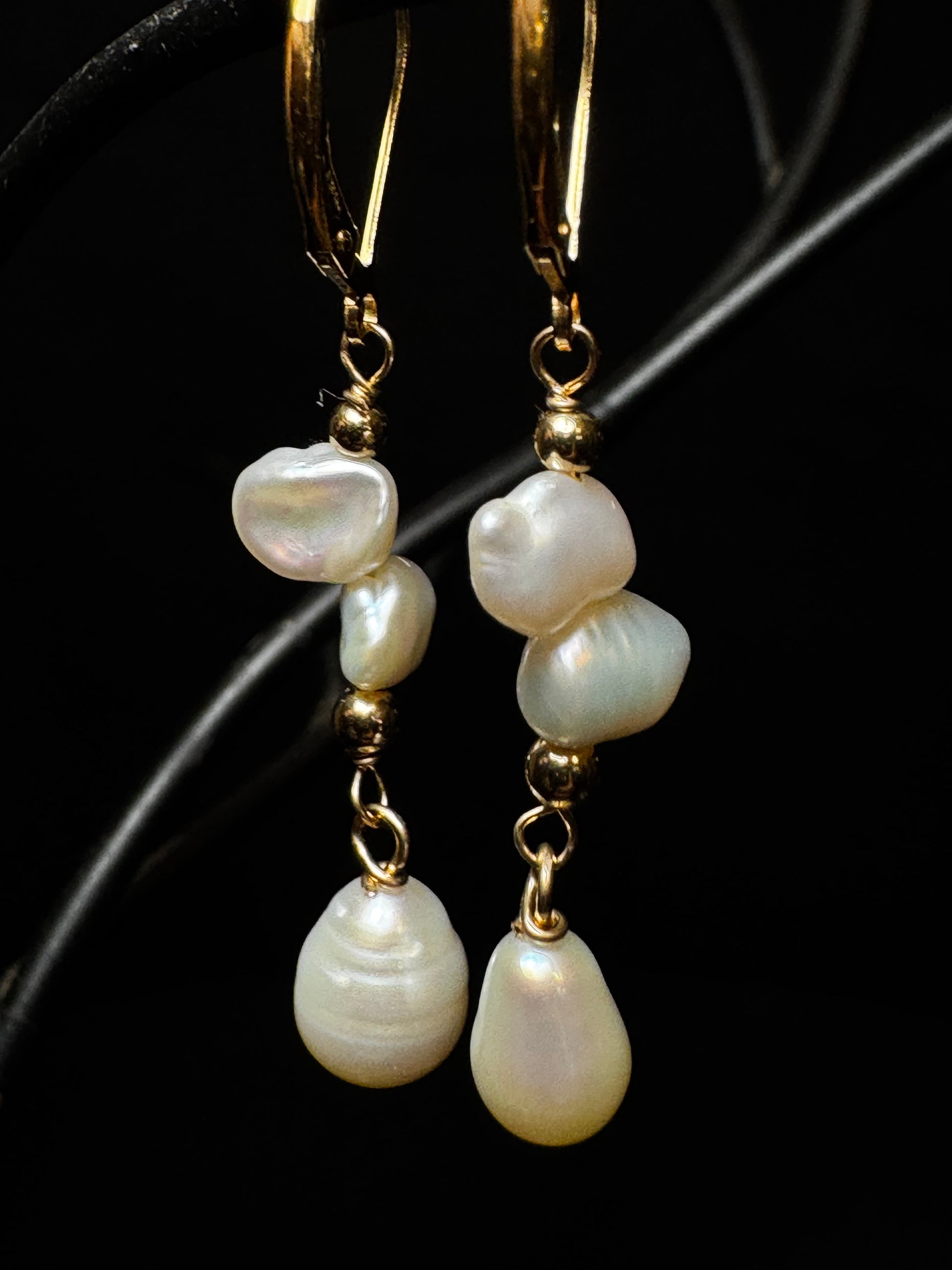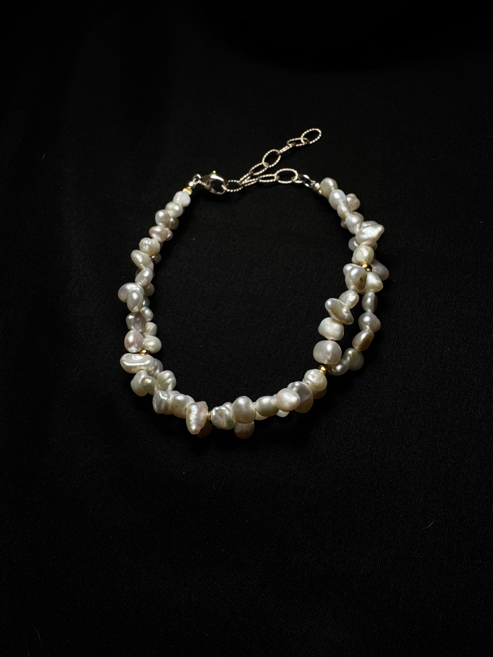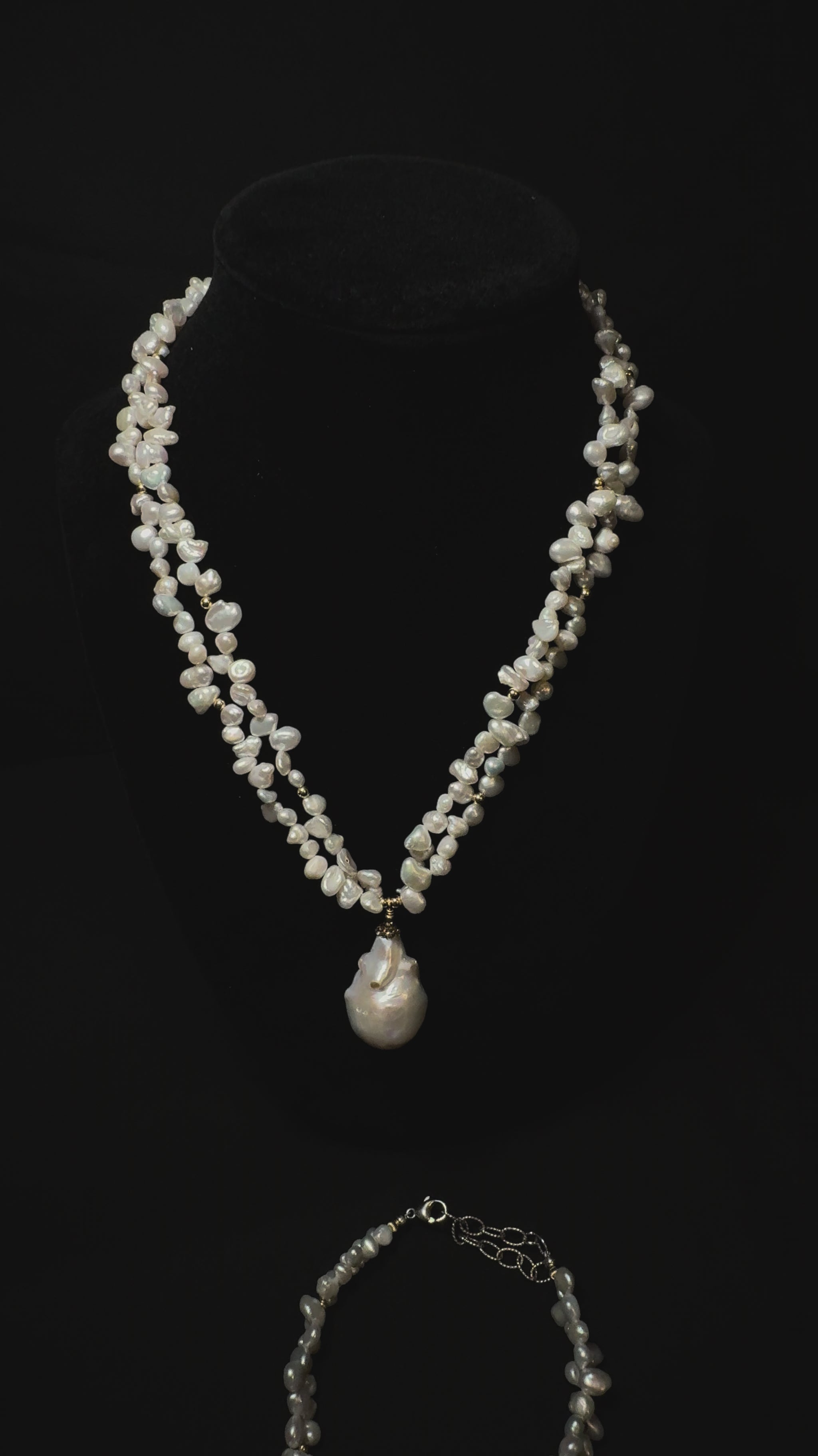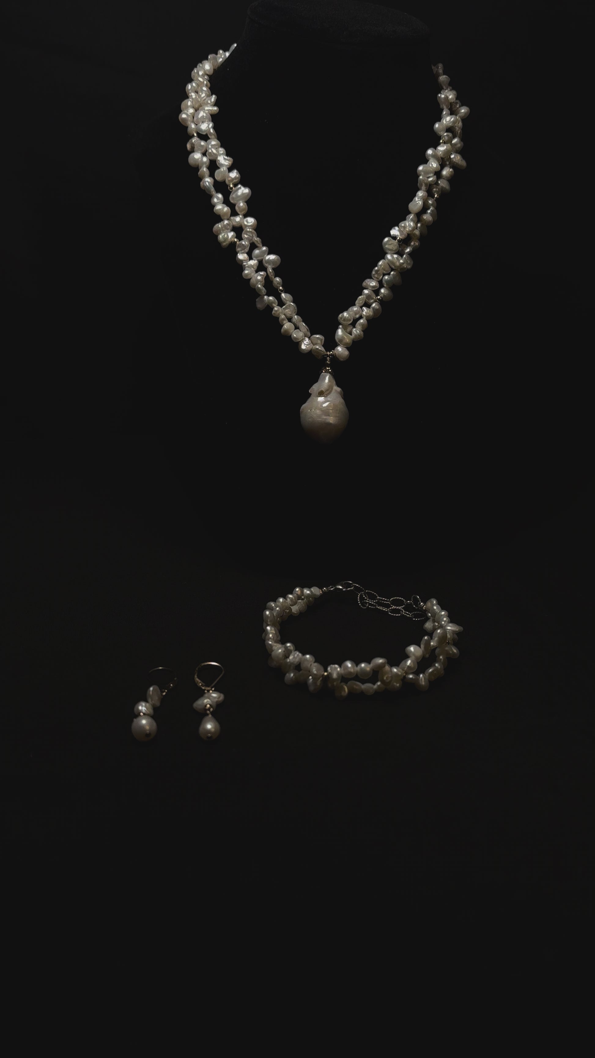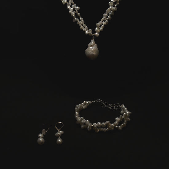 The matching bracelet mirrors the necklace’s graceful rhythm, with double Keshi strands delicately accented by hints of gold and a fine adjustable clasp for the perfect fit. Completing the ensemble, the earrings feature cascading pearls that sway softly with every movement — elegant, balanced, and endlessly timeless.
