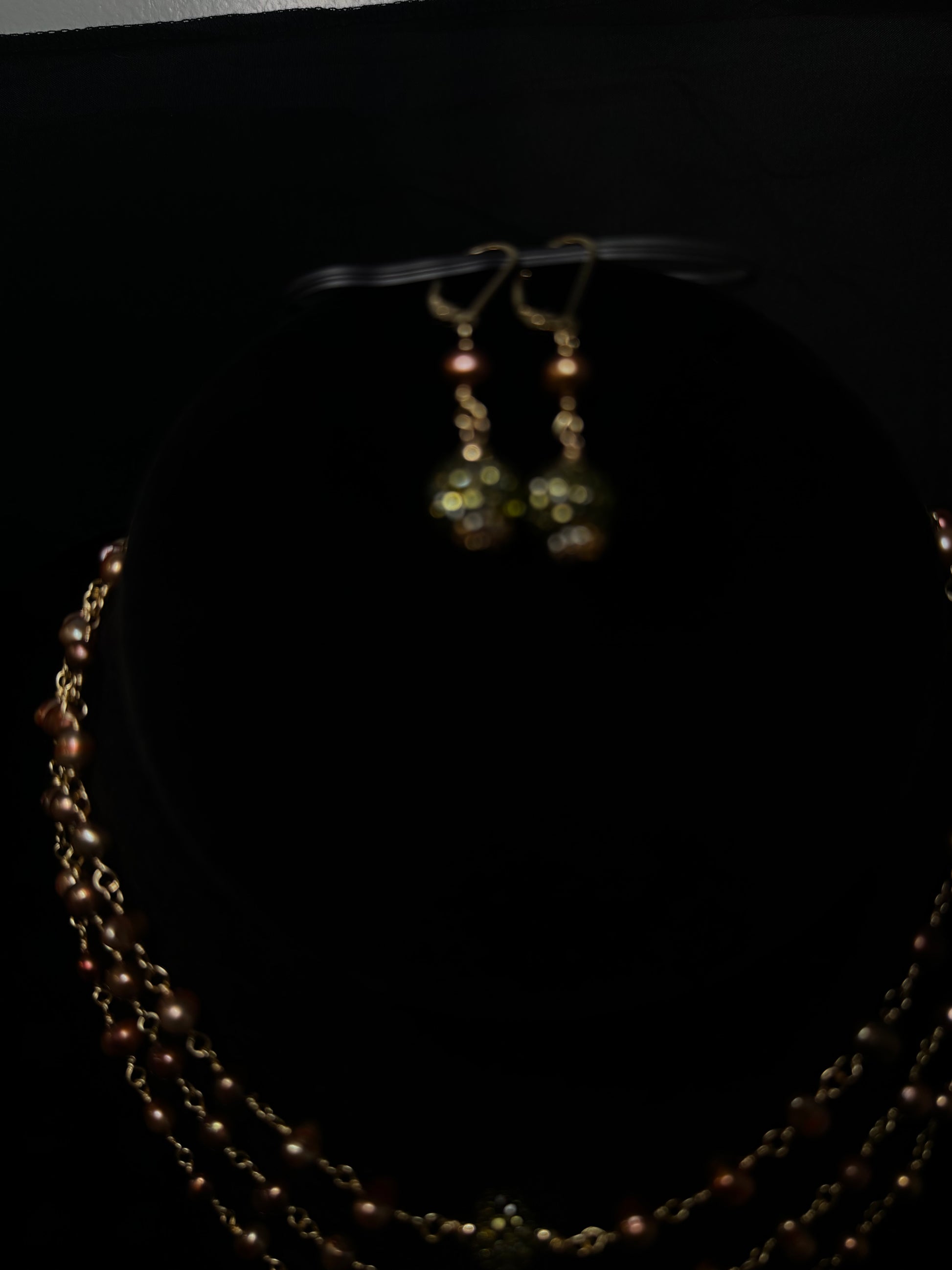 The triple-layer necklace drapes beautifully, each strand adorned with lustrous bronze-toned freshwater pearls and shimmering gold crystal orbs — subtle yet mesmerizing. The bracelet completes the story with an adjustable golden chain that embraces the wrist delicately, while the earrings add the perfect finishing touch with their glimmering drops of light.