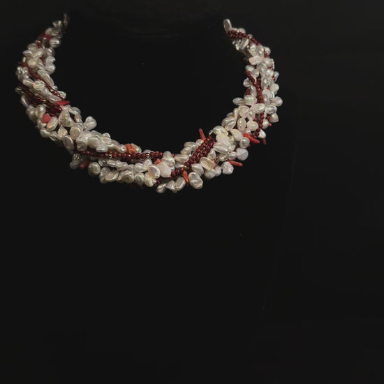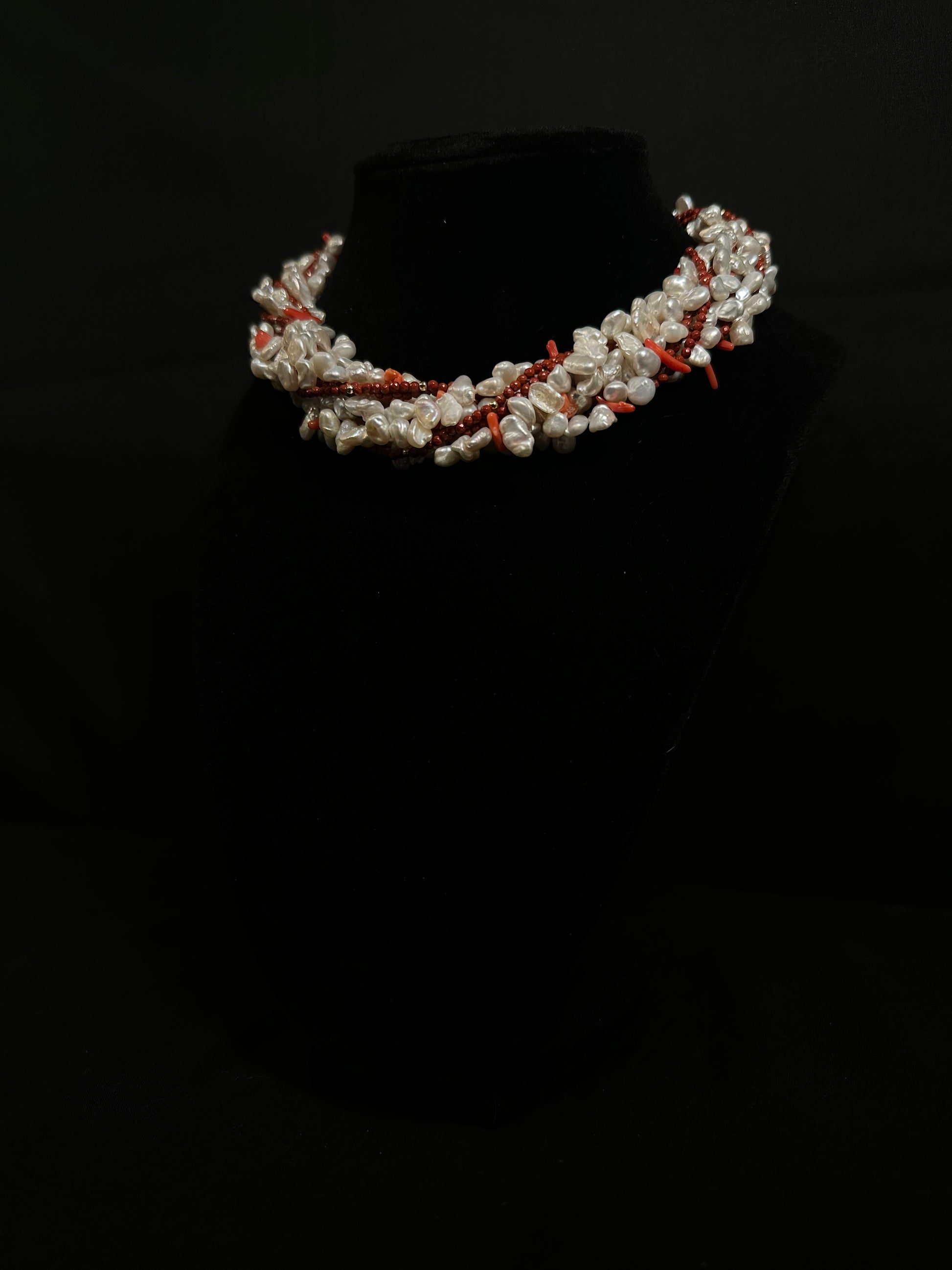 A piece born from the meeting of ocean and flame. Coral de Fuego captures the strength of red coral and the softness of white freshwater pearls, woven together by hand into a bold, sculptural silhouette.