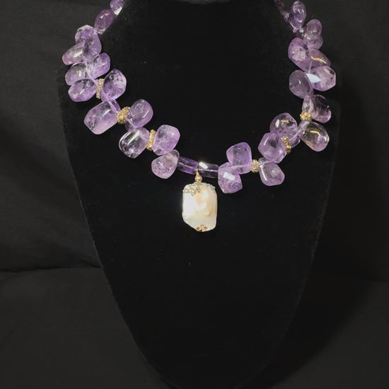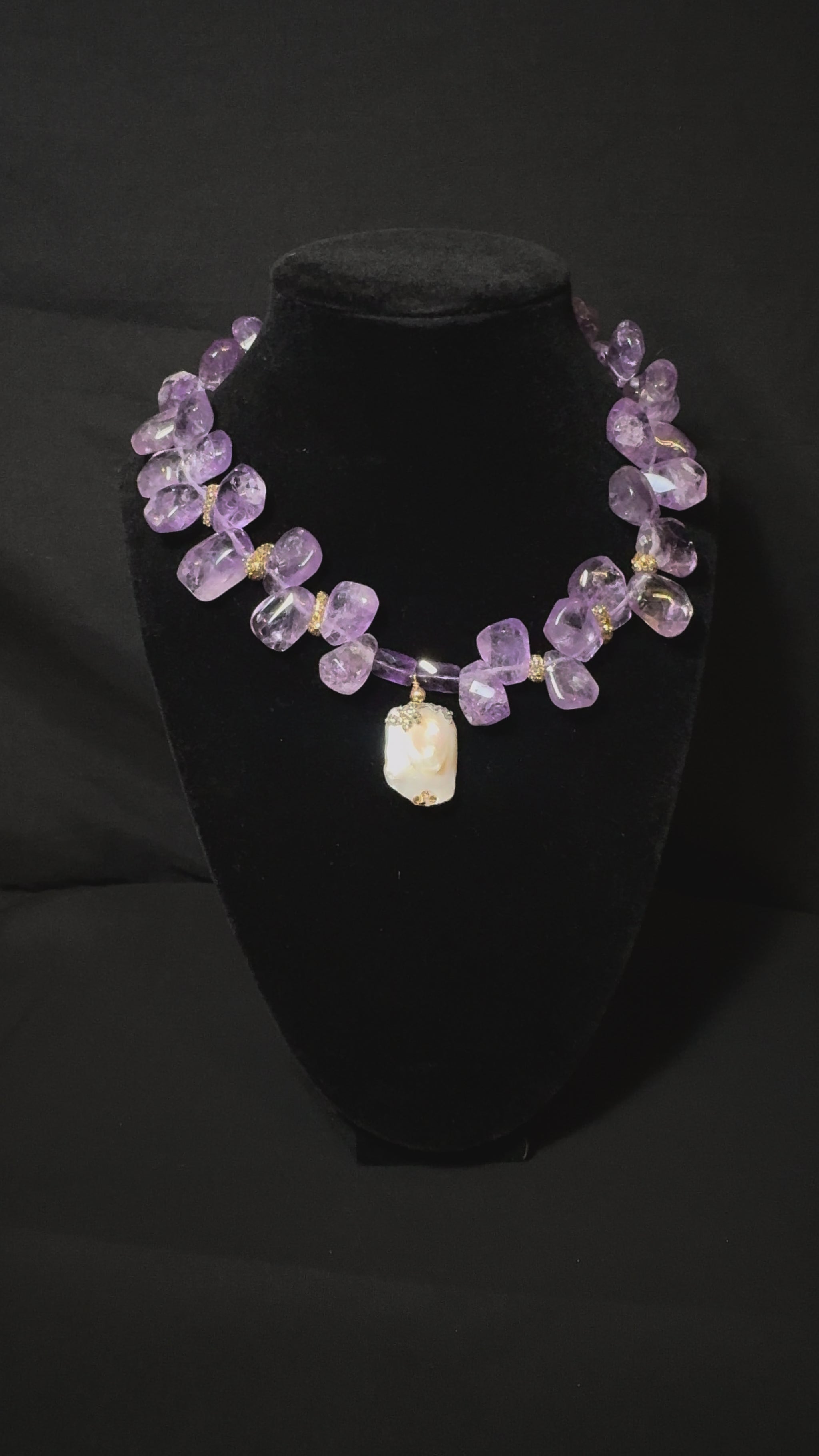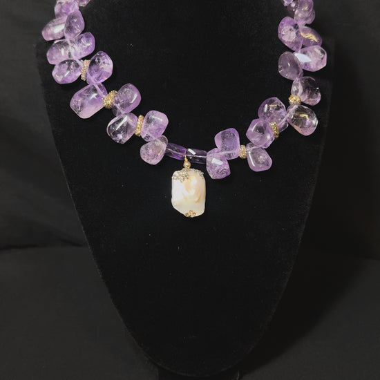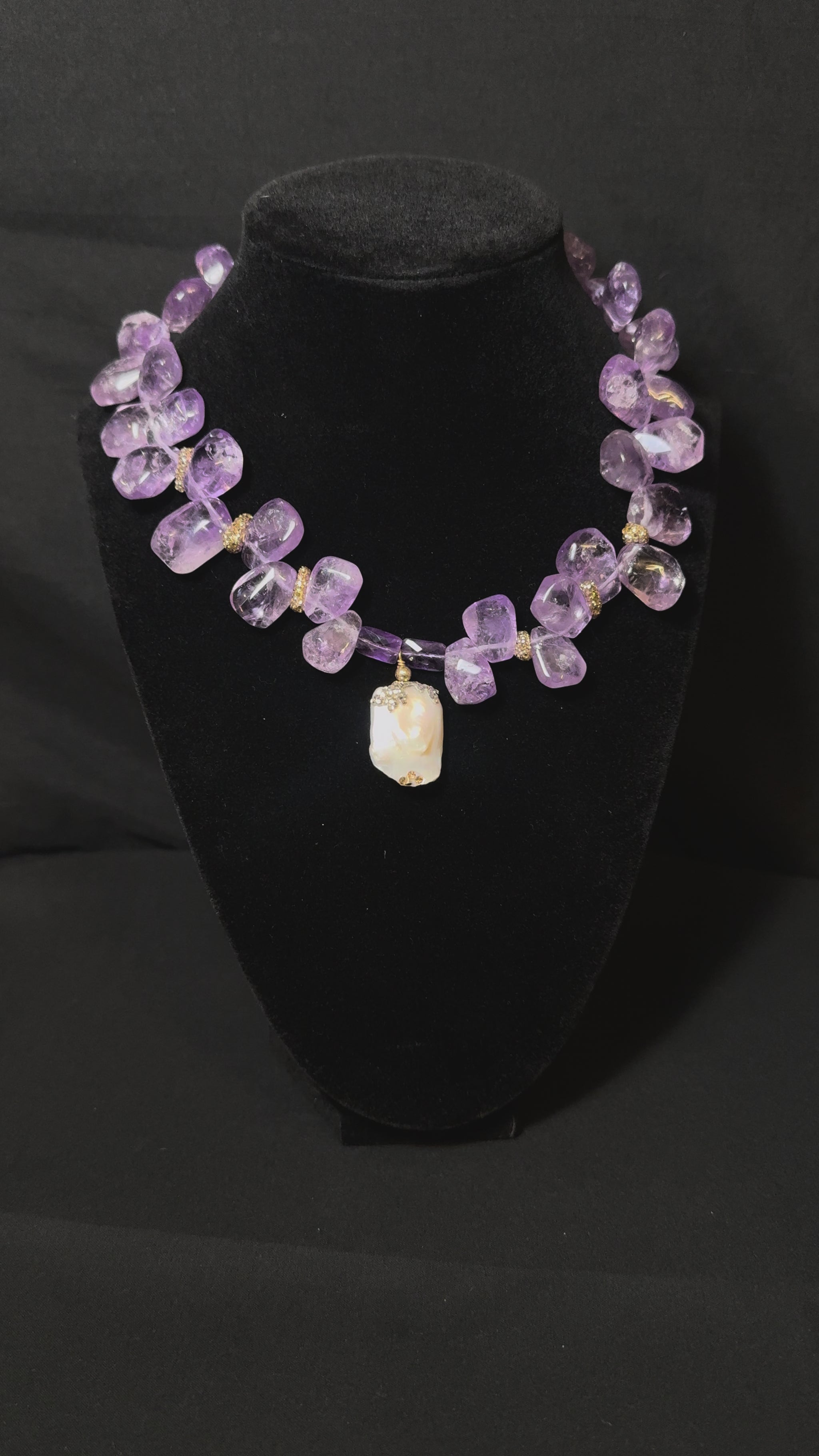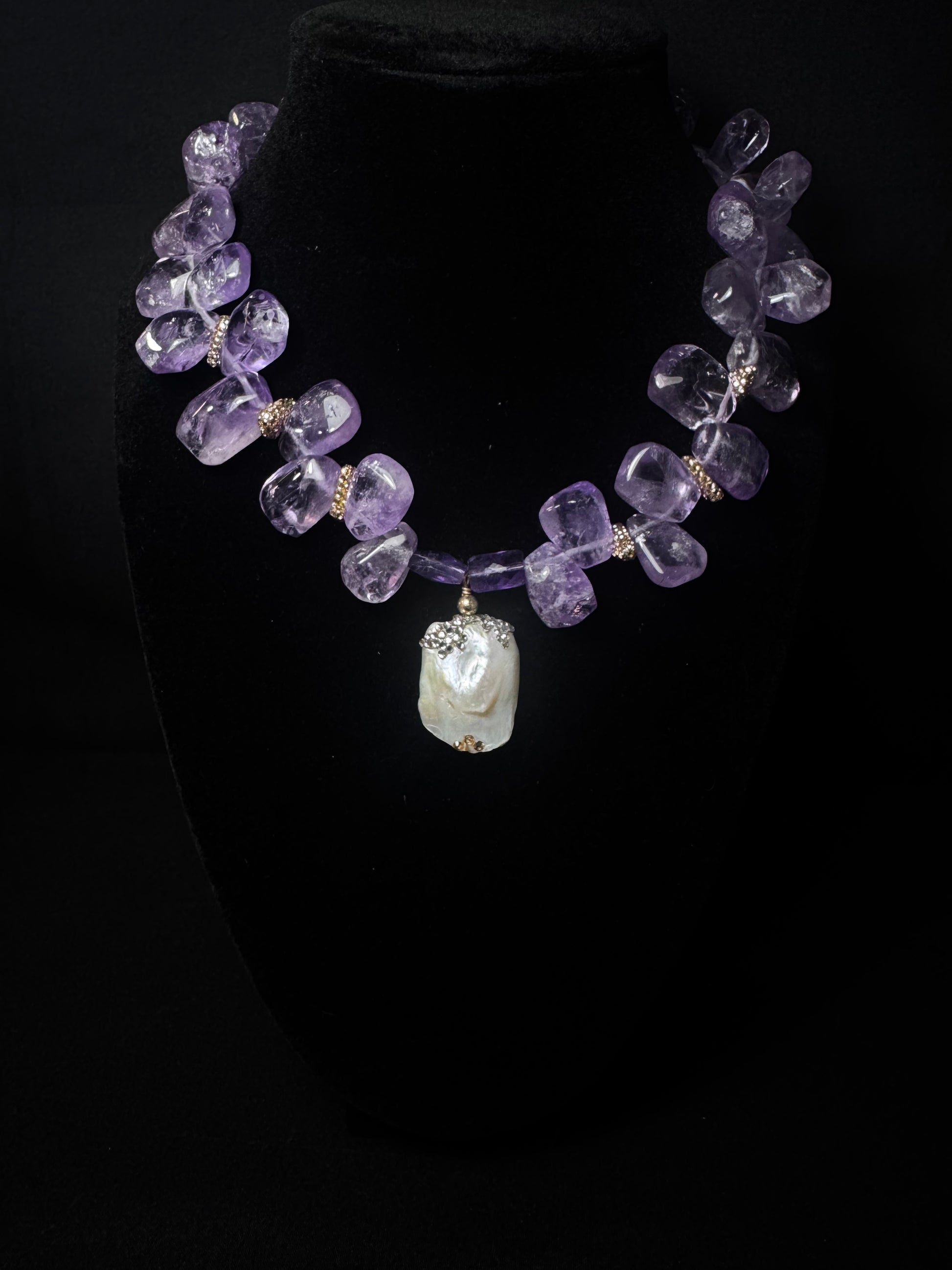Hand‑strung with chunky, organically cut lavender amethyst nuggets, every stone displays a dreamy translucence and natural inclusions that make each necklace truly one‑of‑a‑kind. Between each gemstone, shimmering micro pavé‑set spacers add a flash of sparkle, while a sculptural baroque freshwater pearl anchors the design with its lustrous presence. The soothing purple palette evokes calm and creativity, and the irregular shapes give the piece a raw, artisanal charm that’s totally on‑trend for the new season.