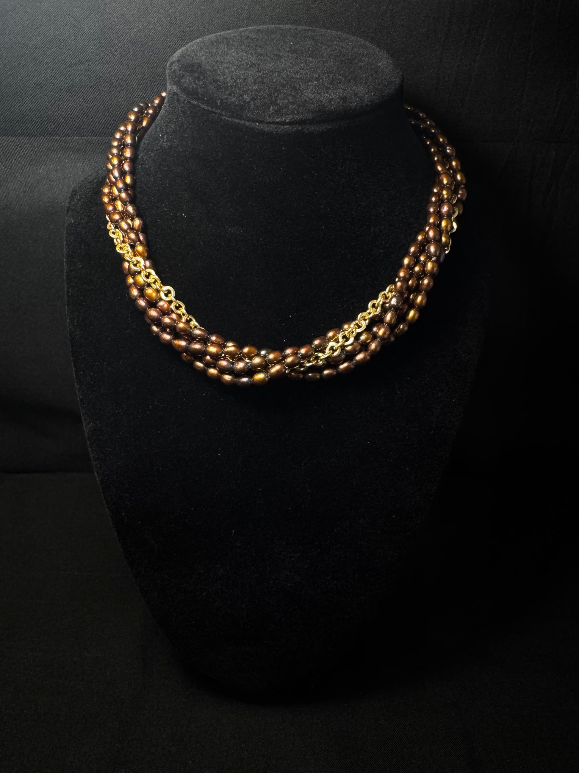 This striking necklace features multiple strands of bronze freshwater pearls, each one naturally iridescent, intertwined with delicate gold-plated chain for texture and movement. The result is a layered masterpiece that shimmers with deep copper, caramel, and golden undertones — reminiscent of fall sunsets and timeless beauty.