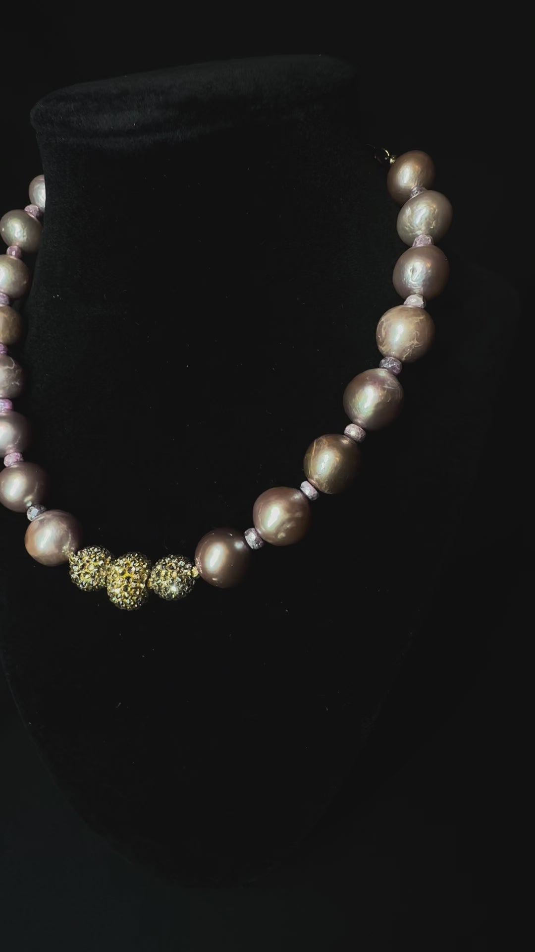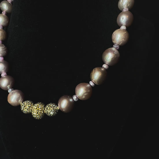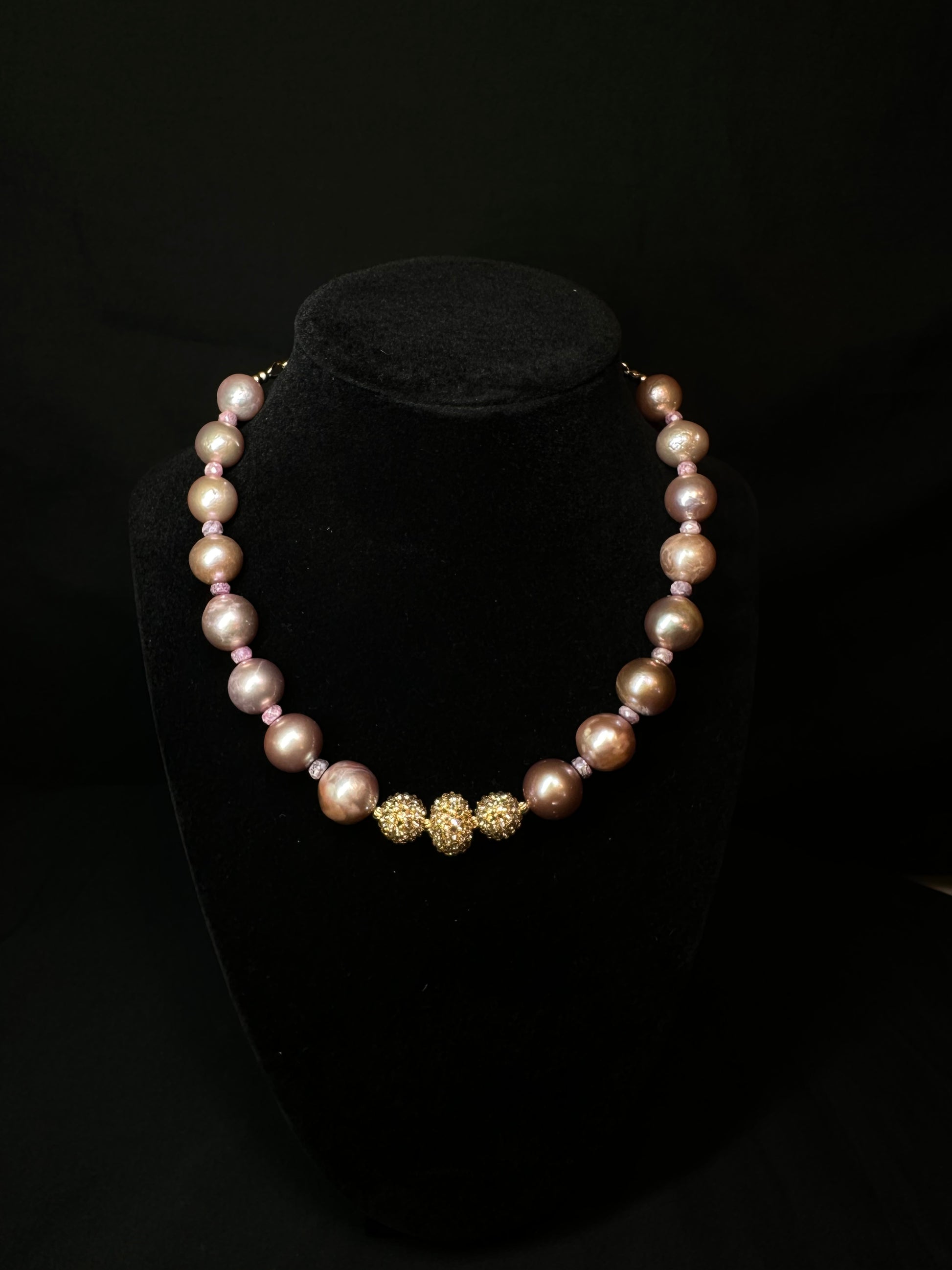 The necklace is a symphony of soft blush tones—each pearl hand-selected for its natural sheen and harmony in size—culminating in a centerpiece of three Swarovski-studded golden spheres that catch the light beautifully from every angle.