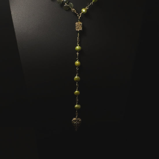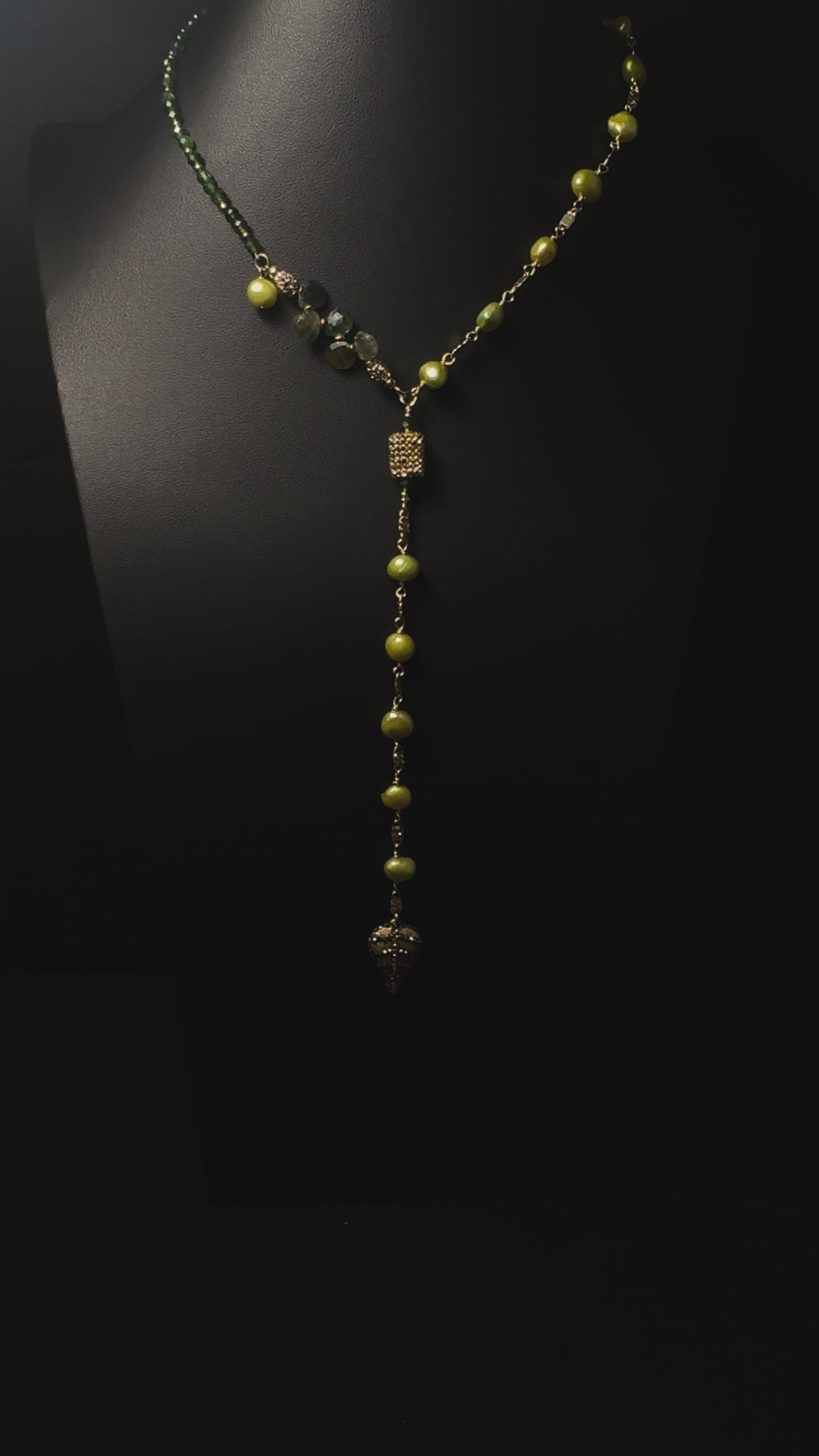 Immerse yourself in the allure of nature’s elegance with the Verde Encantado Necklace — a captivating creation that blends earthy luxury with radiant sophistication. Handcrafted with luminous olive-green pearls and faceted crystals, this piece evokes the freshness of a dew-kissed forest at dawn.