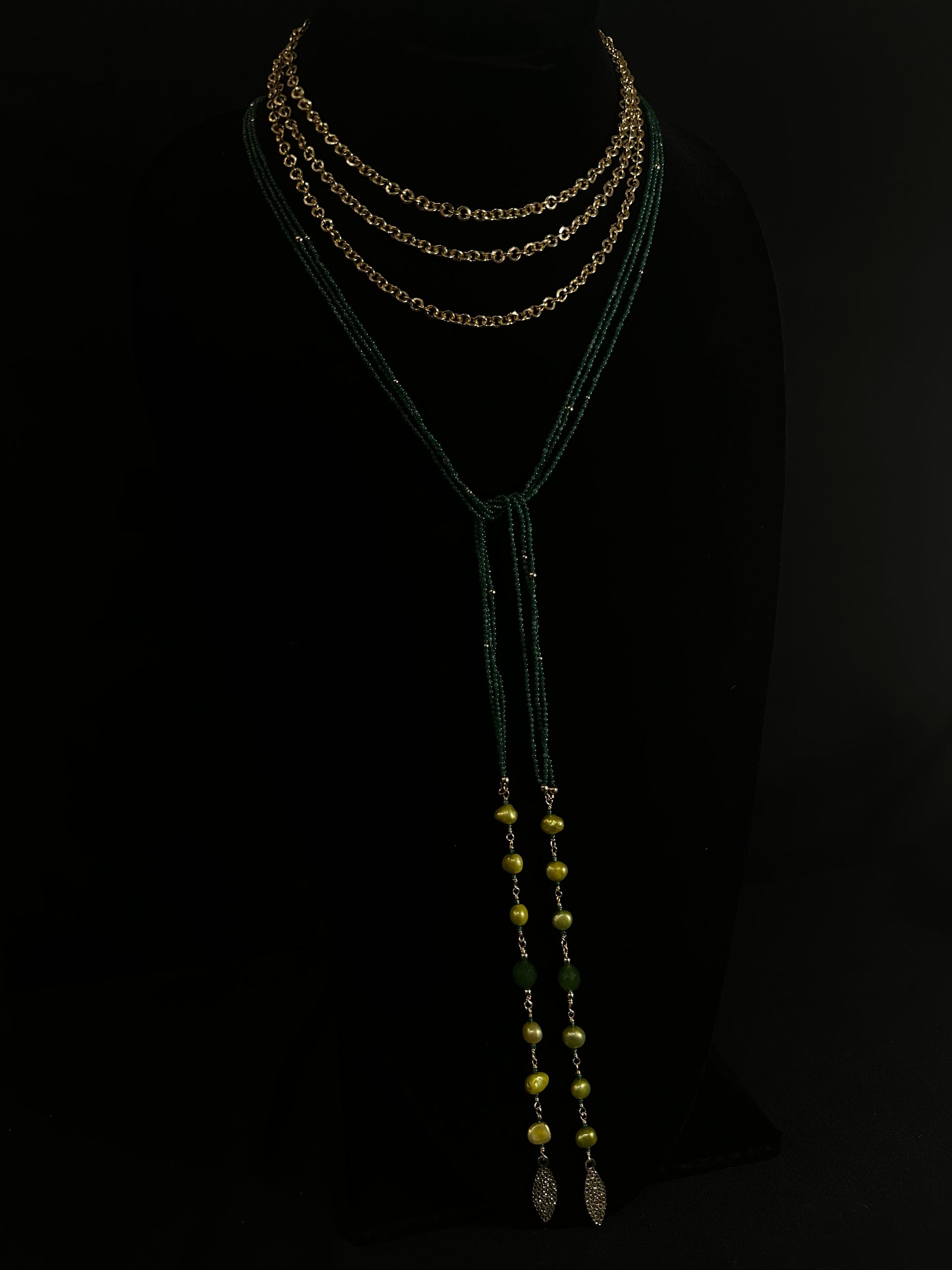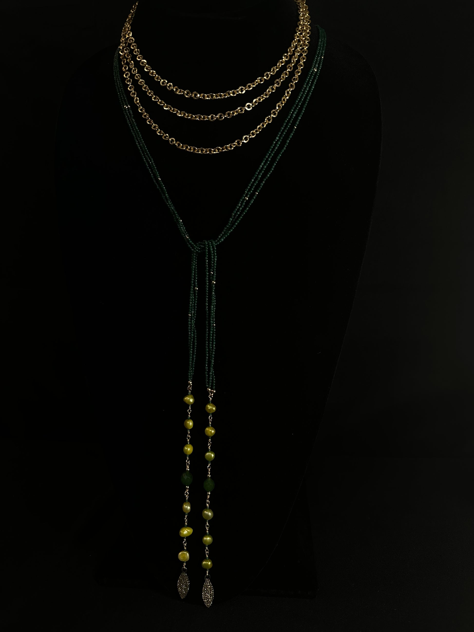 A statement of grace and power, the Encanto Passion Necklace captures the essence of sophistication with a touch of mystique. Its cascading green beads symbolize growth and renewal, while the gold chain layers bring a radiant touch of luxury that effortlessly complements every skin tone.